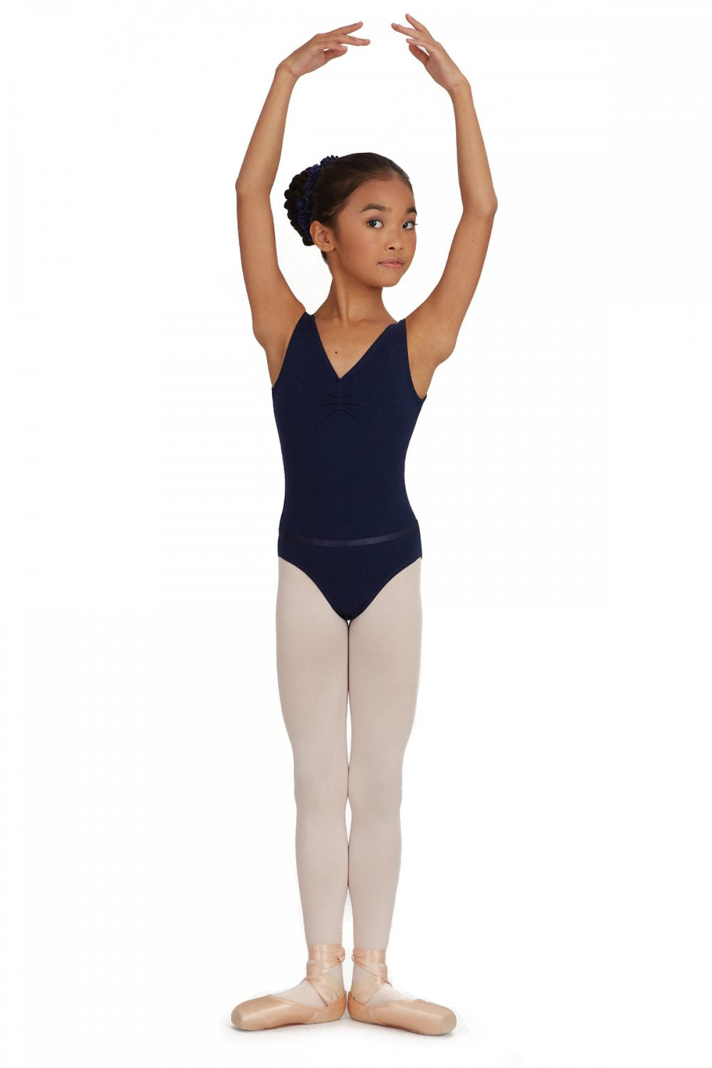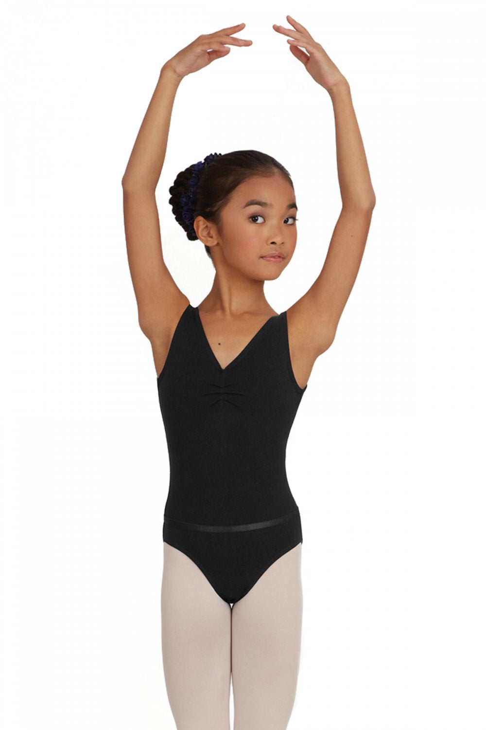 The gorgeous CAD201C children's camisole leotards from Capezio. This delightful girls' sleeveless leotard features a lovely pinched-front and is ideal for dance classes. Featuring a removable belt and a ruched front, the CAD201C is made from a soft Cotton/Lycra blend which ensures your little ballerinas remain cool and comfortable. Fabric 90% Cotton/10% Lycra.