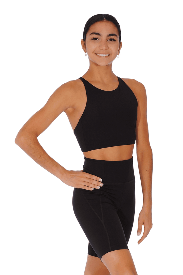 A comfortable crop top, sports bra with cross straps to the back that are fully adjustable. The compressive fabric adds security and is fully lined meaning this top can be worn for workouts, rehearsal or as a comfortable layer.