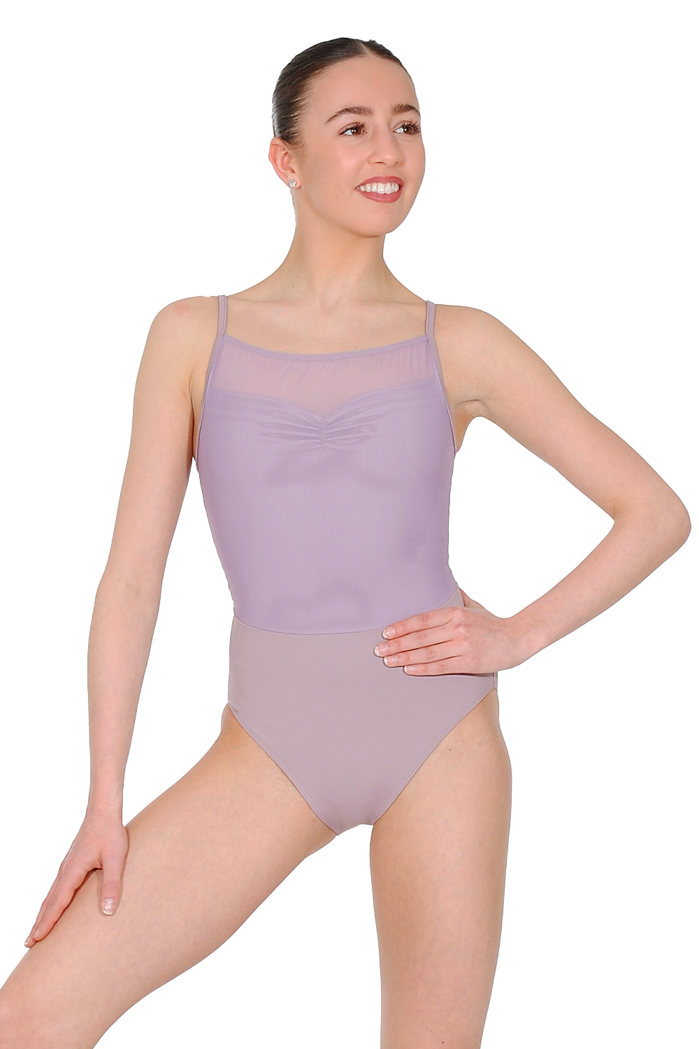 The Intermezzo Federica Cami Leotard is a romantic and refined choice for dancers who love a subtle statement. Designed with slender straps, a delicate mesh chest panel with a front ruche, this women's leotard exudes quiet elegance. The back features a sheer mesh panel with a charming keyhole detail near the waist, offering a soft and graceful finish. Made from high-quality, stretchy material, it ensures comfort and ease of movement in every plié and arabesque. Available in timeless Black and graceful Mauve, the Federica leotard is perfect for ballet, contemporary, and lyrical styles.