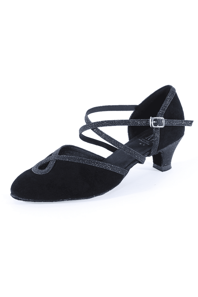 Bring the shimmer to the show with Roch Valley's RVANNA Ladies Wide Fit Ballroom Shoe. The stunning Anna shoe includes black glitter edging, quality flexi suede soles and a convenient buckle for quick fastening. The 1.8" Spanish heel is absolutely perfect for any ballroom performance and will help you dance all night! The Anna is available from size 3 to 8, and includes half sizes!