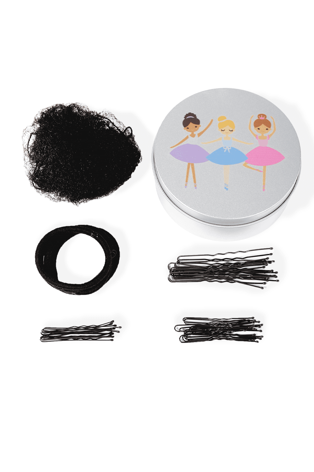 Create the perfect ballet bun with Roch Valley's Hair Accessory Tin. Featuring a pretty trio of ballerina's on the top of the tin, this is an essential part of every dancers accessory kit. Whether for dance class, or exams this re-usable tin has everything you need (and more) for a neat and tidy bun, and is available in three colour options - Blonde, Brown or Black.