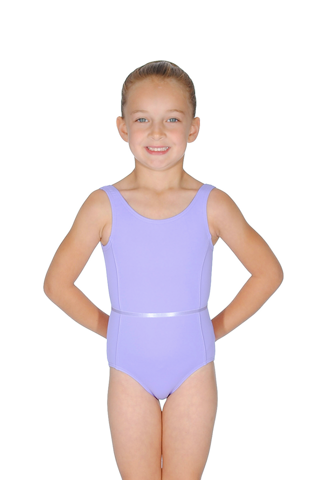 The Roch Valley RVBeatrice microfibre leotard with princess seams. This sleeveless girls' leotard is front lined and includes a slim 8mm  elasticated waist belt. Available in 10 beautiful colours and is ideal as class wear.