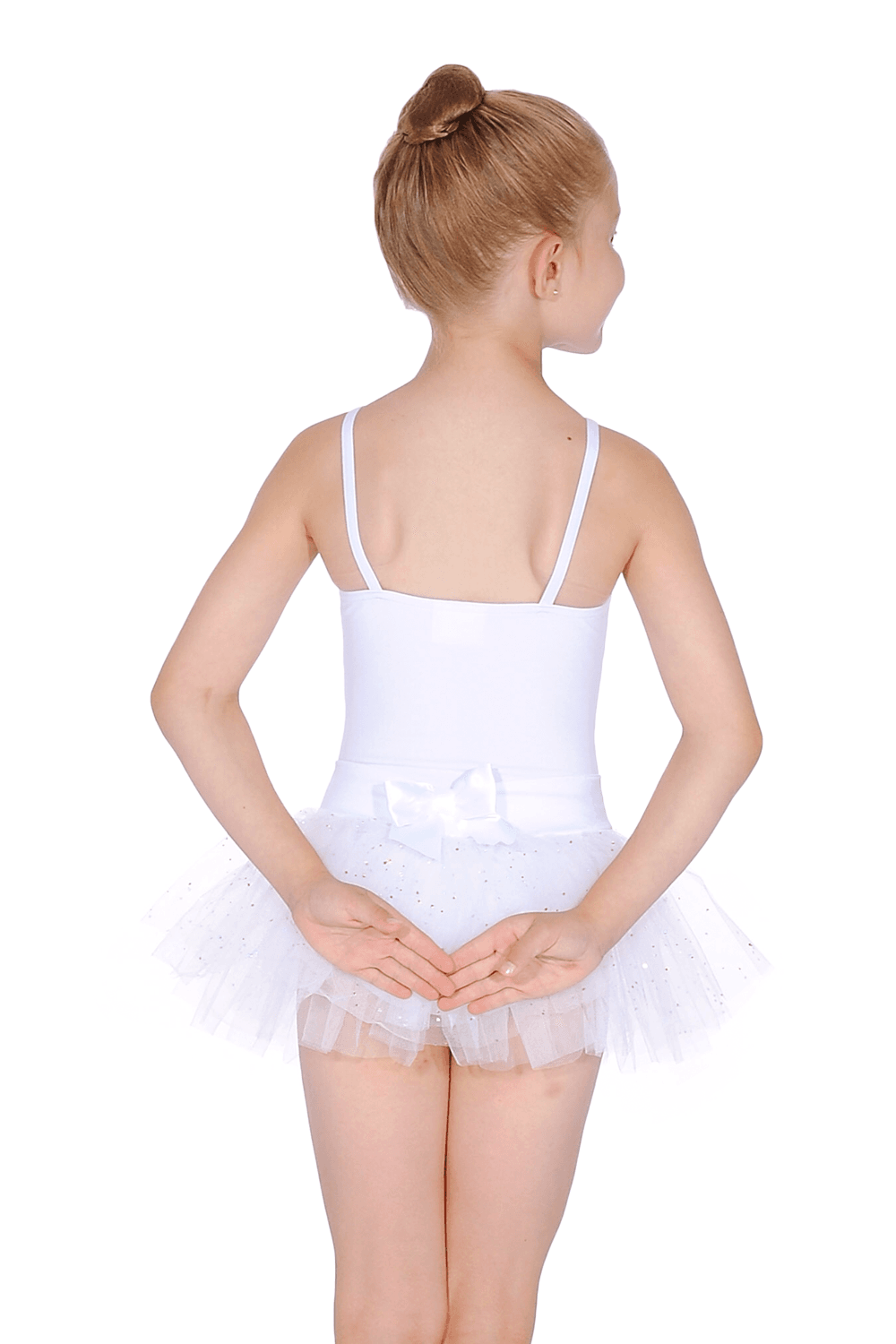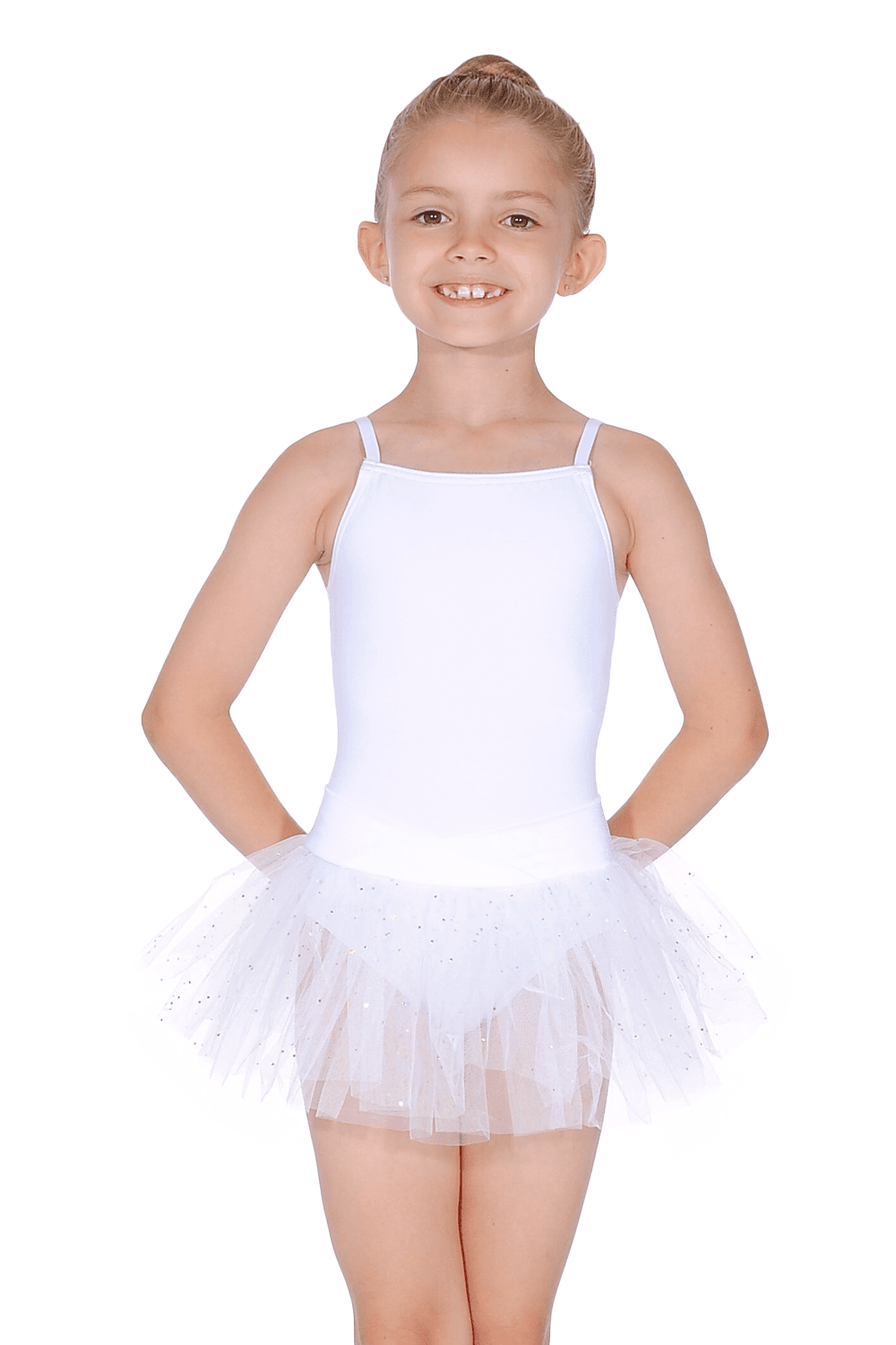 Glittering N9814C children's camisole tutu dress from Capezio. The beautiful N9814C features a soft Cotton/Lycra leotard with camisole straps, an attached glittering tutu skirt with a deep satin waistband, and back bow detail. Irresistibly cute, Capezio's camisole tutu dress is perfect for performances and makes a fantastic gift for the little ballerina in your life.