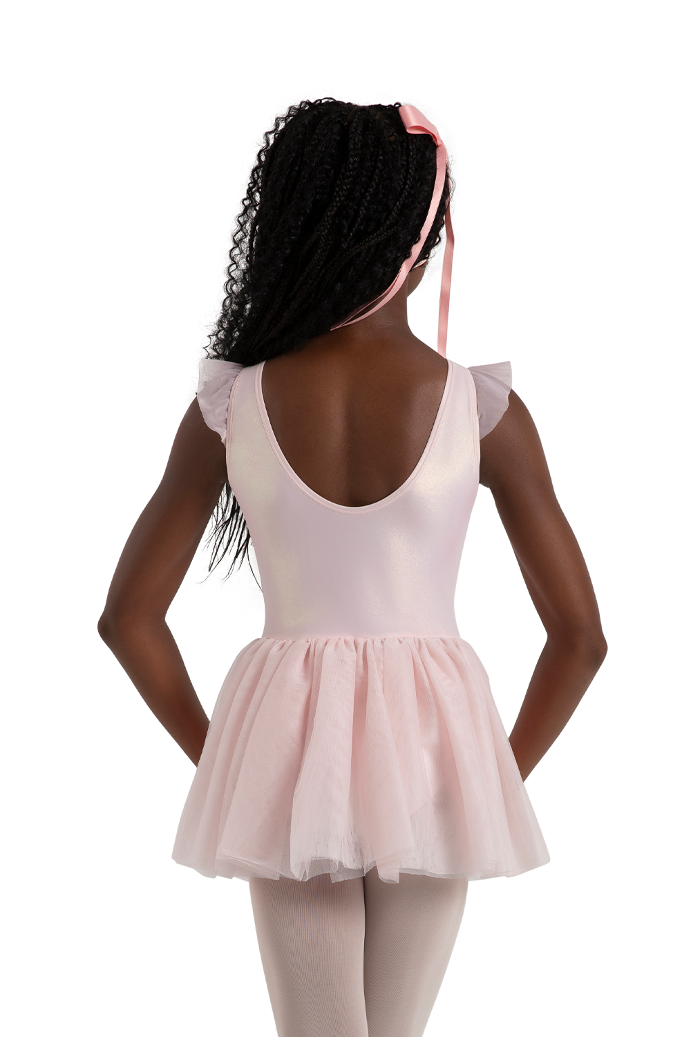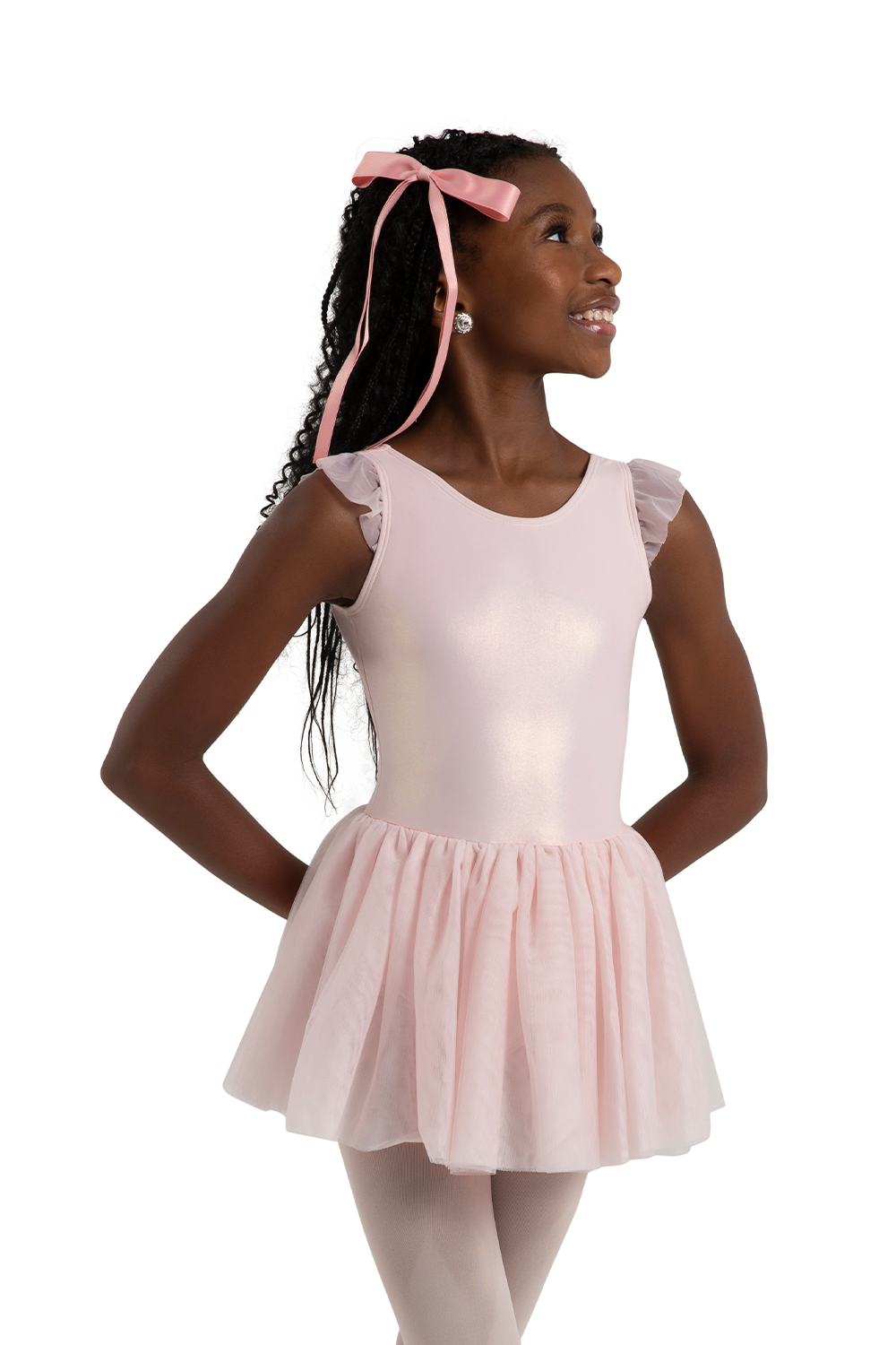 The Capezio Voyage Tutu Dress combines elegance and fun with its radiant shiny bodice and delicate ruffle short sleeves. The classic tutu skirt allows for graceful movement, making it perfect for ballet classes, recitals, or any special dance event.