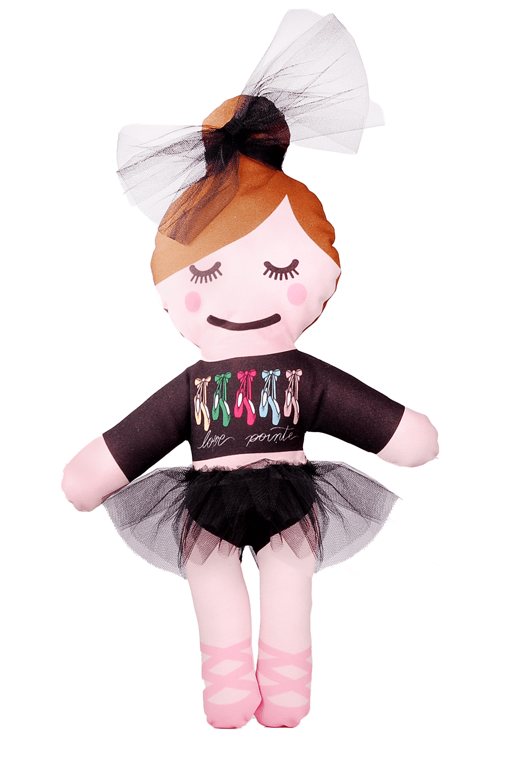 Made with love in Barcelona, Spain by ballet loving brand El Petit Ballet, this beautiful plush soft doll wears a "love Pointe" t-shirt and black net tut skirt and matching net bow. A perfect present for dancers, whether for a birthday, good luck, Christmas or congratulations!
