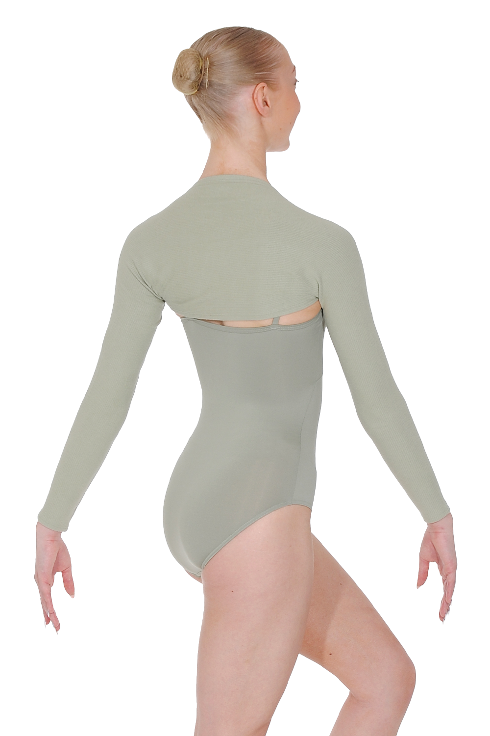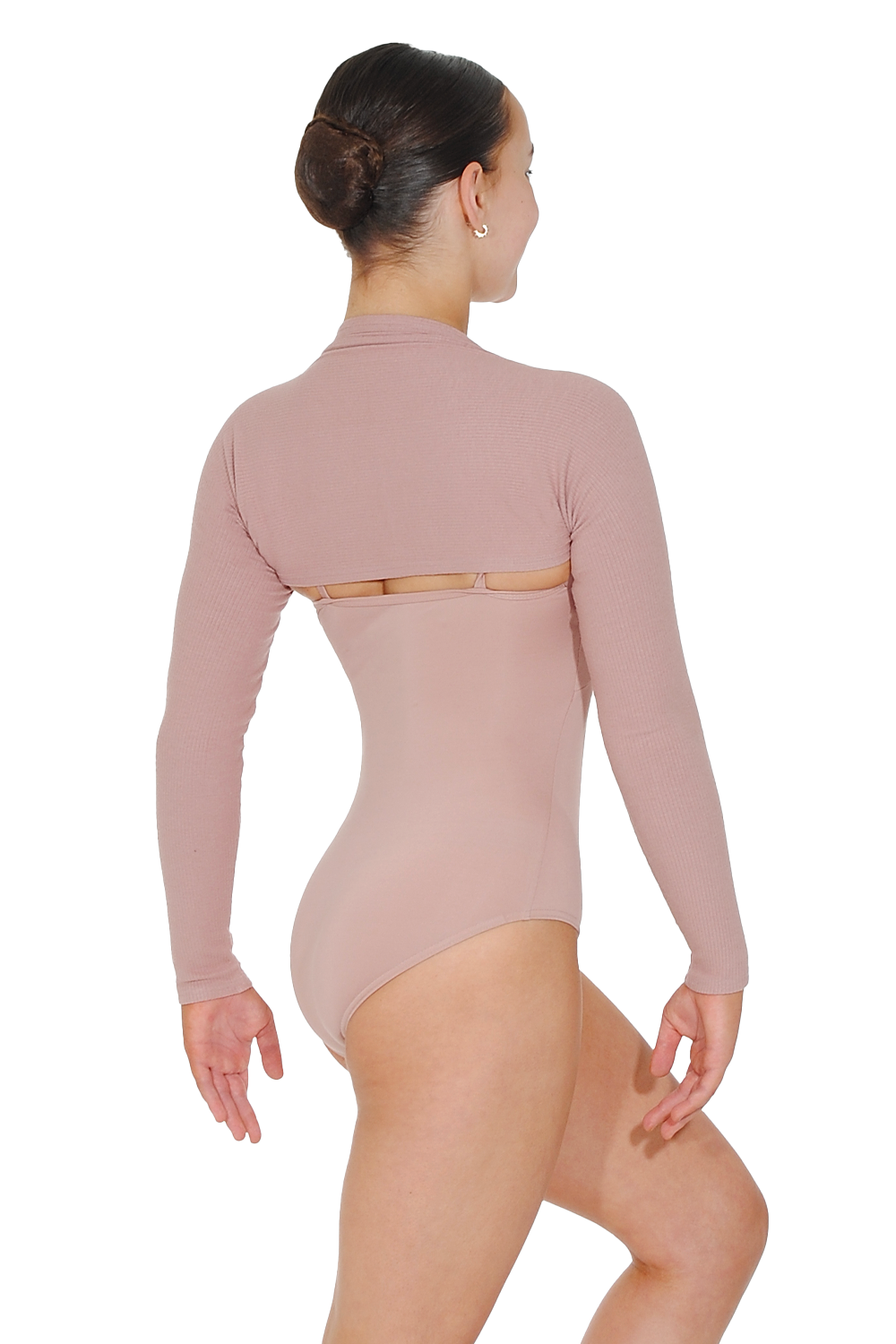 The Inesse Bolero style shrug is available in three beautiful soft knit colours - Pistachio, Coral Almond and Mocco. With long sleeve and an open front design this is a perfect layer to add to your rehearsal or class outfit.