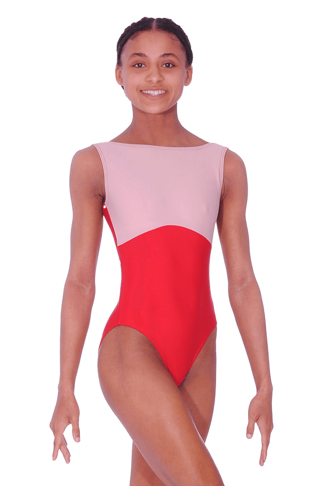 The striking colour blocking combination of red lower bodice with oyster pink upper panel elevates this simple shape to another level of effortless chic in the dance studio. Great coverage and fit means that it is possible to wear a bra under this leotard.