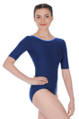 The stunning SMK 3/4 length sleeve leotard. This rich midnight blue leotard is made from Creora® fabric which is not only good for the environment but also gentle on your skin. The round neck and deep "U" shaped back offers a very flattering look, enhanced by complimentary trim around the neckline edge. Ideal for your class, rehearsal or performance.