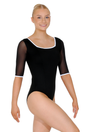 Classic black, elegant, and beautifully versatile the Libby Three-quarter Sleeved Leotard is a timeless essential for every dancer’s wardrobe. Designed to elevate both practice and performance, the Roch Valley Libby features sleek mesh sleeves for added refinement and a flattering square neckline. The vertical panels enhance your natural lines and create a flattering silhouette. The stretchy, breathable fabric ensures full freedom of movement, while the optional bra-cups and full front lining keep you supported through every port de bras and pirouette. Perfect for ballet, contemporary, ballroom, or studio rehearsals, this leotard pairs effortlessly with skirts, shorts, or warm-ups to suit your style. Additionally, the contrast colour white binding sets this apart from your standard black leotard.